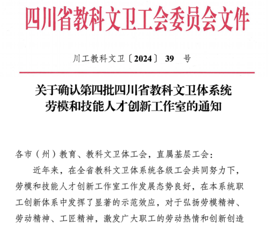 12月10日,四川省教科文卫工会发布《关于确认第四批四川省教科文卫体系统劳模和技能人才创新工作室的通知》,我校舒国成博士团队名列其中。据悉,此批全省共30个创新工作室获评 “第四批四川省教科文卫体系统劳模和技能人才创新工作室”。