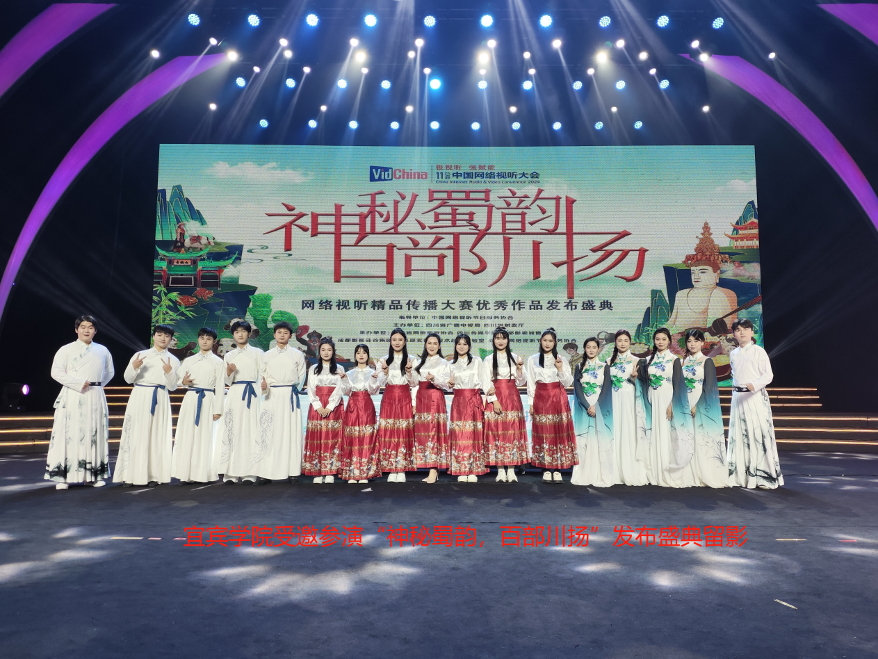 近日,第十一届中国网络视听大会首场活动“神秘蜀韵 百部川扬”网络视听精品传播大赛优秀作品颁奖盛典在四川传媒学院艺体中心成功举办。本次活动由四川省广播电视局、四川省财政厅主办,四川省网络视听协会、四川传媒学院等单位承办,宜宾学院受邀参演,在校团委和文艺学部的大力支持下,邓静老师带领16名学生圆满演绎了苏轼古谱诗乐舞作品《定风波·莫听穿林打叶声》。